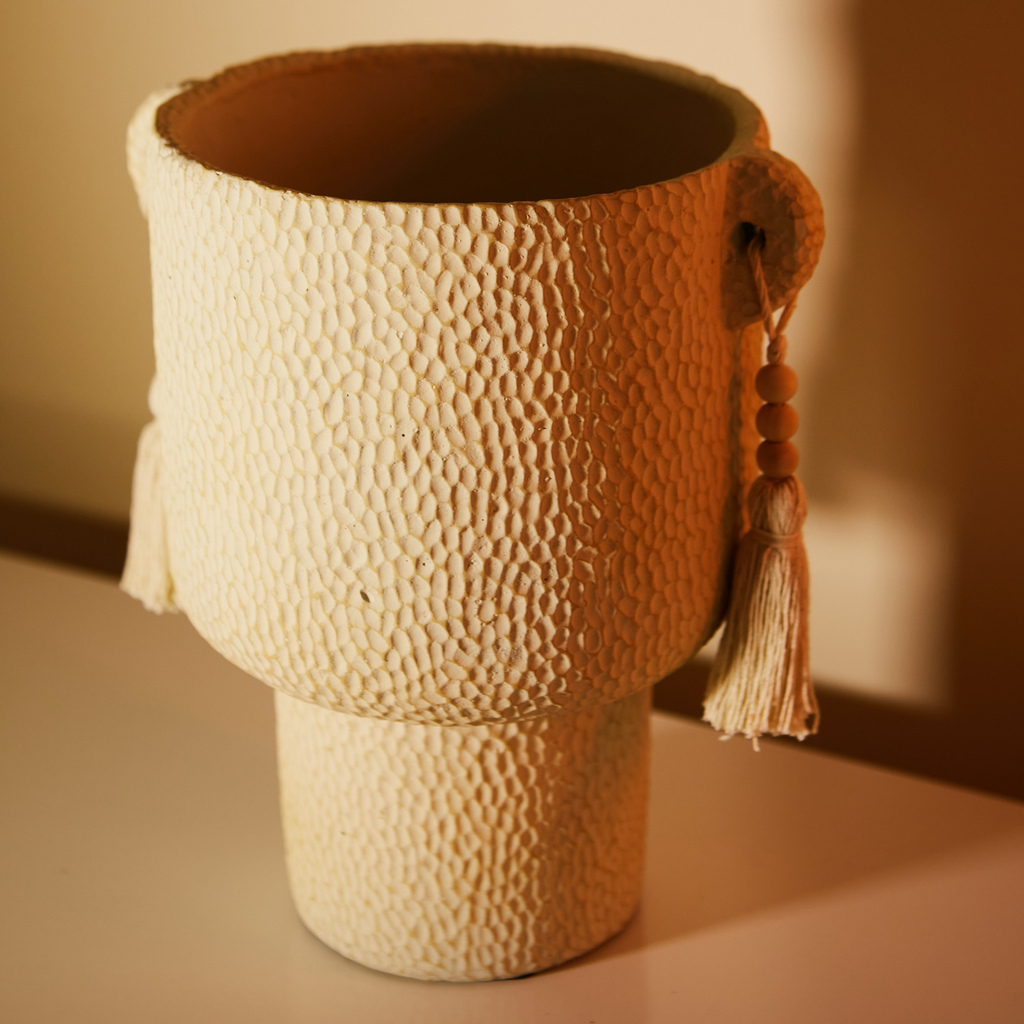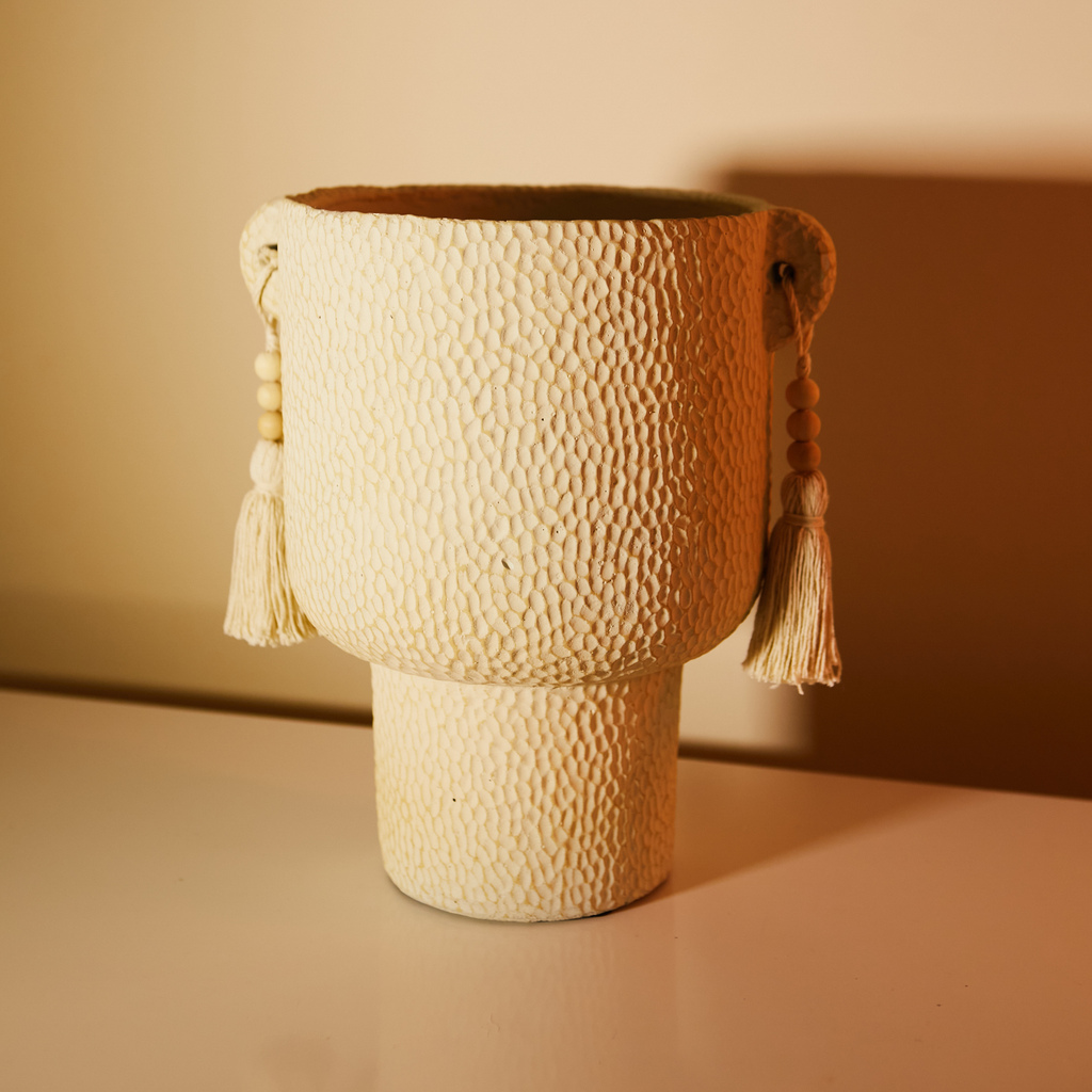 Com detalhes elegantes em tassel e conta em madeira natural, este cachepot vem em duas opções de tamanho, permitindo que você escolha o que melhor se encaixa na sua decoração: